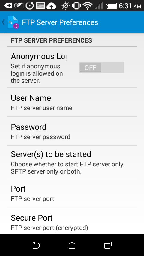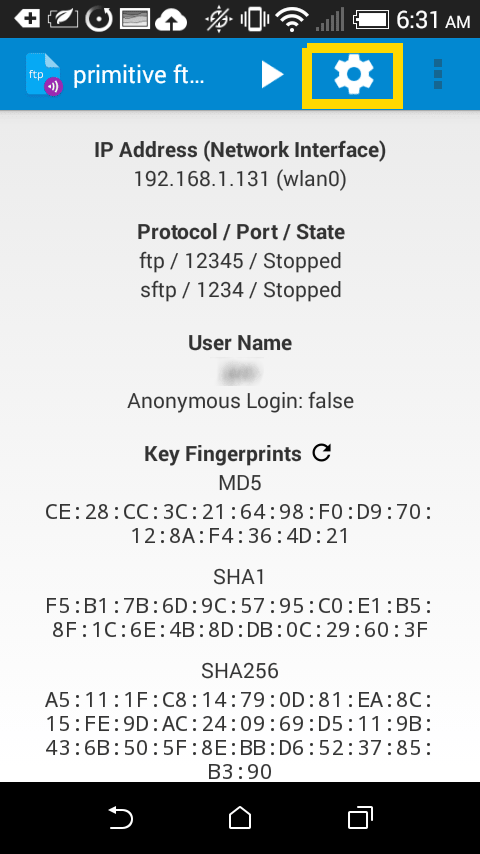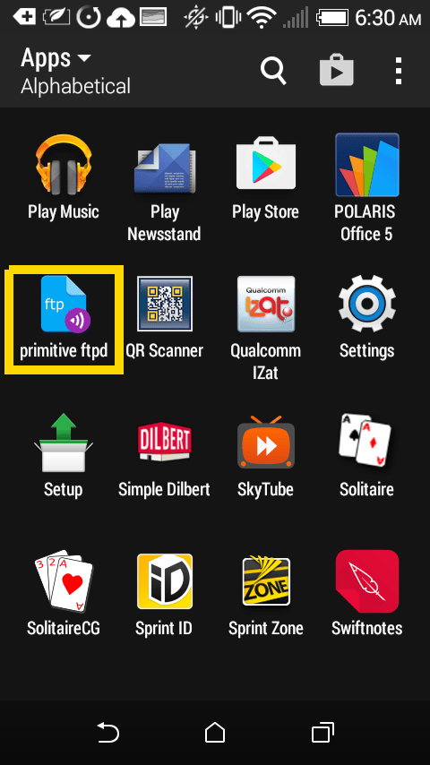 安装好 FTP 客户端和服务端之后,就是设置两者之间的连接了。先从安卓设备的 FTP 服务端开始,首先,通过应用启动器打开 primitive ftpd。