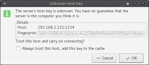点击连接,输入密码即可。你会看到一个连接新主机的警告,这是可以在此验证屏幕上显示的“指纹信息”是否与 Primitive FTPD 上的一致。如果一致 (也应该是一致的),点击确认添加都已知主机列表,之后就不会出现该警告了。
