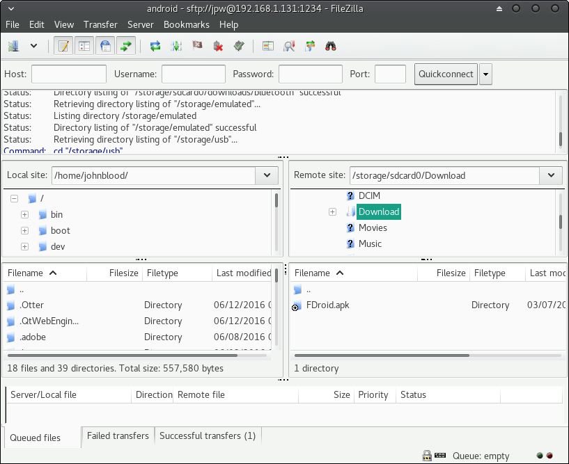 现在,你会看到两个框,一个是“本地站点”,一个是“远程站点”,对应的呈现了你电脑和安装设备上的目录和文件信息。然后你就可以在电脑端浏览和传输文件到你的安卓设备上了。个人建议上传文件到你的 Download 文件夹,以便于文件跟踪管理。你可以右击某个文件,在弹出的菜单中选择上传或者下载以及移动操作,或者简单双击也行。