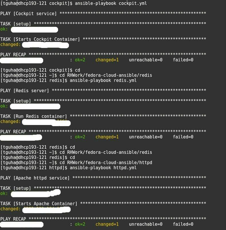 现在是运行 Ansible 的 PlayBook 的时候了。此命令开始运行原子主机上的 Cockpit 容器: