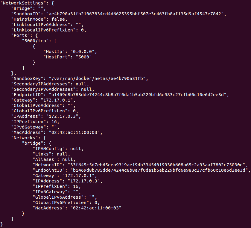 我们可以看到这个容器的 IP 地址是 "IPAddress": "172.17.0.3"。