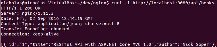 HTTP/1.1 200 OK Date: Tue, 30 Aug 2016 15:25:43 GMT Transfer-Encoding: chunked Content-Type: application/json; charset=utf-8 Server: Kestrel [{"id":"1","title":"RESTful API with ASP.NET Core MVC 1.0","author":"Nick Soper"}]