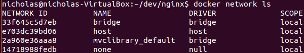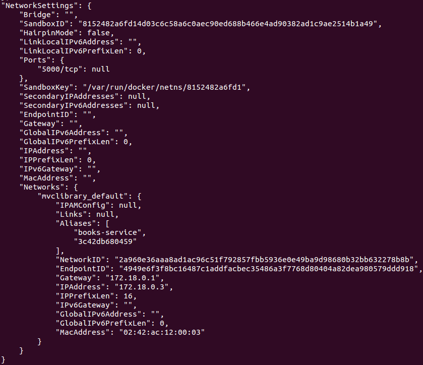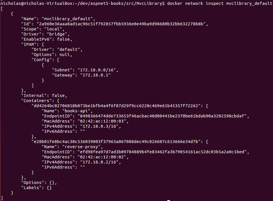 你可以使用 docker network inspect mvclibrary_default 来看到新的网络的细节: