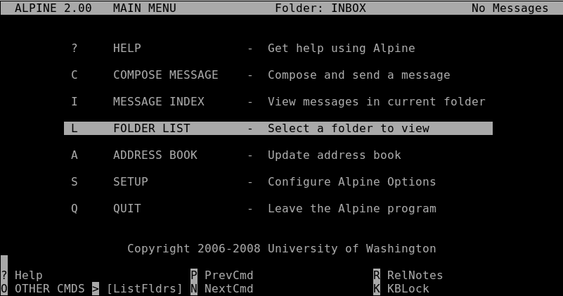 要在终端里发邮件,选择有很多。很多人会推荐 mutt 和 notmuch,这两个软件都功能强大并且表现非凡,但是我却更喜欢 alpine。为何?不仅是因为它的高效性,还因为如果你习惯了像 Thunderbird 之类的 GUI 邮件客户端,你会发现 alpine 的界面与它们非常相似。