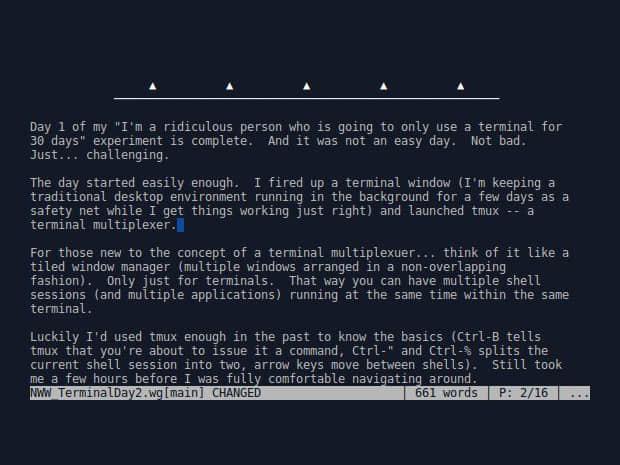 在一个只有文本的 shell 之中,“文本编辑器” 和 “文字处理程序” 实在没有什么大的区别。但是像我这样需要大量写作的,有一个专门用于长期写作的软件是非常必要的。而我最爱的就是 wordgrinder。它由足够的工具让我愉快工作——一个菜单驱动的界面(使用快捷键控制)并且支持 OpenDocument、HTML 或其他等多种文件格式。