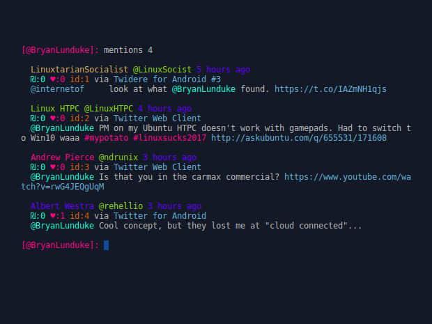 这不是开玩笑!由于 rainbowstream 的存在,我们已经可以在终端里发布推文了。尽管我时不时遇到一些 bug,但整体上,它工作得很好。虽然没有网页版 Twitter 或官方移动客户端那么好用,但这是一个终端版的 Twitter,来试一试吧。尽管它的功能还未完善,但是用起来还是很酷,不是吗?