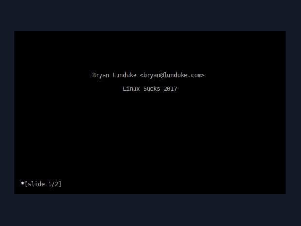 这类软件有 LibreOffice、Google slides、gasp 或者 PowerPoint。我在讲稿演示软件花费很多时间,很高兴有一个终端版的软件。它称做“文本演示程序(tpp)”。很显然,没有图片,只是一个使用简单标记语言将放在一起的幻灯片展示出来的简单程序。它不可能让你在其中插入猫的图片,但可以让你在终端里进行完整的演示。