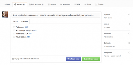 敏捷方法中,用户故事里通常要包含验收指标或者标准。在 GitHub 里,建议大家使用 markdown 格式的清单来概括解决这个问题单需要完成的任务。优先级越高的问题单应当包含更多的细节。