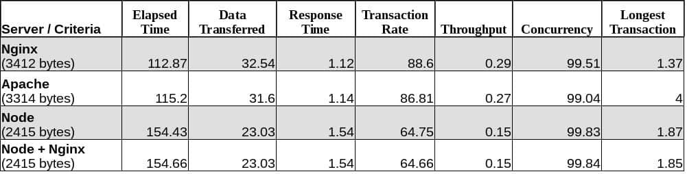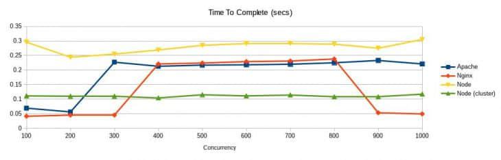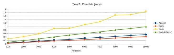 还有一个相当惊人的事实是,在特定的用户并发数和请求数下,Node.js 可以比 Nginx 和 Apache 更快。