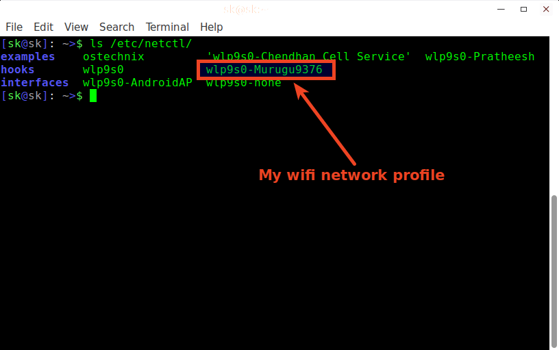 ls /etc/netctl/ Sample Output: examples ostechnix 'wlp9s0-Chendhan Cell Service' wlp9s0-Pratheesh hooks wlp9s0 wlp9s0-Murugu9376 interfaces wlp9s0-AndroidAP wlp9s0-none