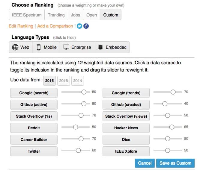 有一些网站依据不同的标准,公开发布了一些语言流行度指标。 IEEE Spectrum 对这些指标做了一个有趣的整合,它可以让你通过自行设置不同因子的权重来得到你自己的编程语言流行度排行榜。