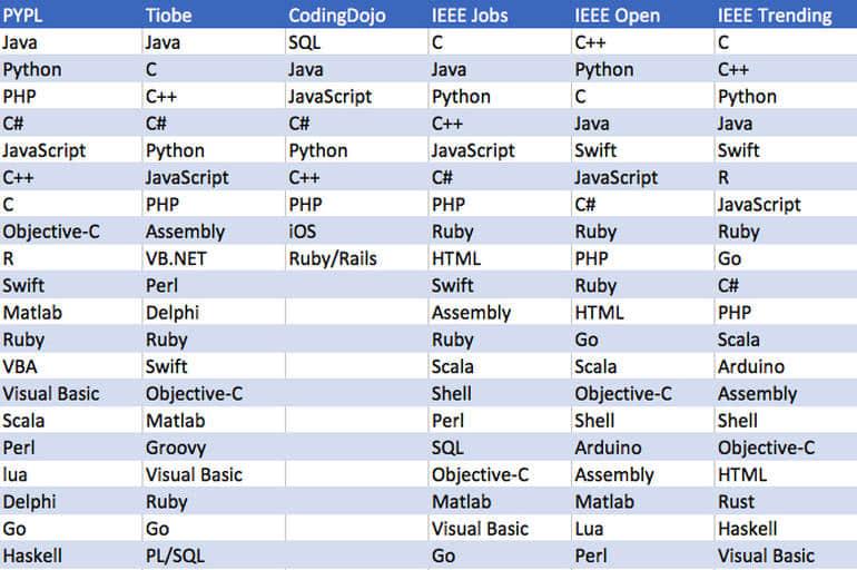 如你所见,这些语言分成了三大类。第一梯队包括 Java、C、Python 和 C++,毫无疑问,你肯定经常听到它们的名字。第二梯队包括 JavaScript、C#、PHP 和 Swift。剩下的两个是 Objective-C 和 R。