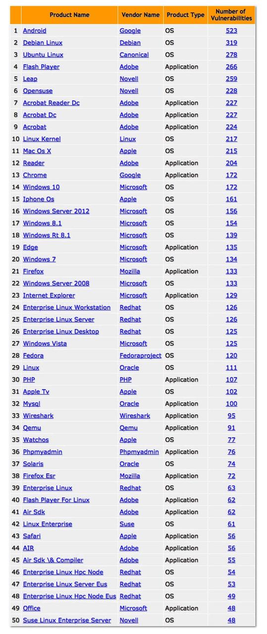 让我们来看看微软的产品,在该列表中,排名最高的微软产品是 Windows 10 ,有 172 个缺陷,连前十名都没进去。