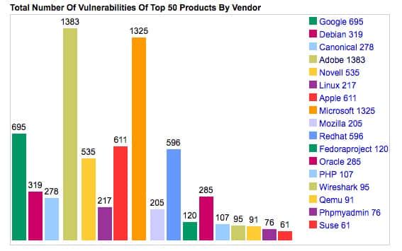 上图中,虽然 Adobe 和微软的安全缺陷总数非常高,但是其实这里包含的安全缺陷很多是重复的——同一个安全缺陷出现在多个产品之中。
