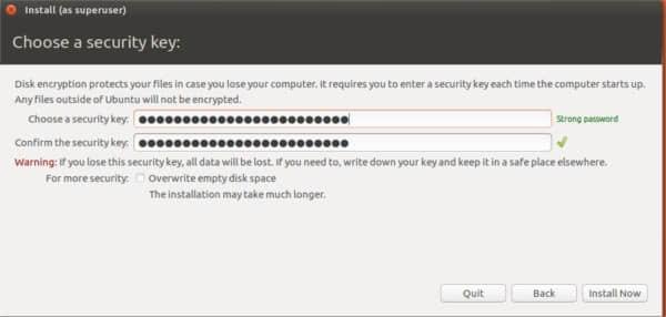 进行磁盘加密之后,如果没有加密密钥则无法开启 Ubuntu。尽管无趣,但这种级别的加密使用最容易的,并且还充分利用了操作系统提供的特性。用户不需要过多的知识,或者使用其他第三方程序就可以很快完成加密要求。
