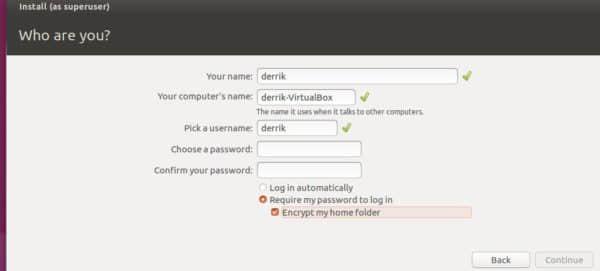 与创建和加密 Ubuntu 磁盘对应,在创建用户的时记得候选择“ 登录系统需要密码 ”和“ 加密我的家目录 ”。这样可以为你的数据再增加一层保护。