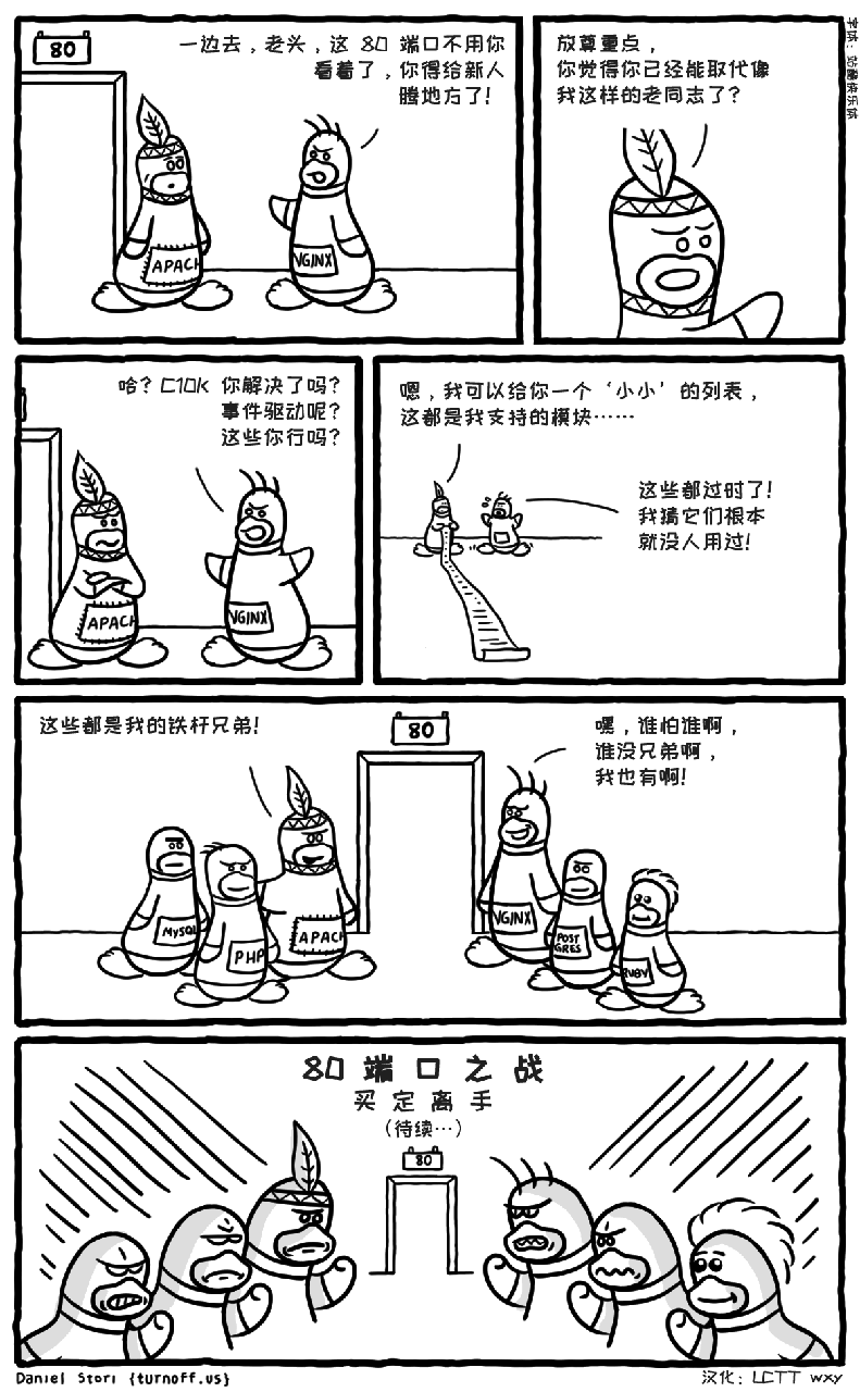 嗨,大家好,今天我们来聊聊 80 端口之战。著名的技术漫画站 turnoff.us 有这样的一副漫画,生动的描绘了固守 80 端口的 Apache 和新生代的 Nginx 之间的战争。你知道,80 端口是 Web 端口,就是这个端口构成了我们现在大部分的互联网。