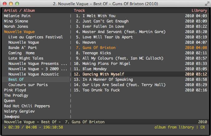 如果你钟爱命令行程序,那么 Cmus 会是你的菜。你能用它来播放 Ogg Vorbis、MP3、FLAC、Opus、Musepack、WavPack、WAV、AAC、MP4、音频 CD 以及 ffmpeg 支持的所有格式(WMA、APE、MKA、TTA、SHN 等等)和 libmodplug。你也可以用它来播放 Shoutcast 或者 Icecast 的音频流。它不是特性最丰富的音乐播放器,但它拥有所有的基础及进阶功能。它的主要优势是非常轻量,并且它的内存需求真的很小。