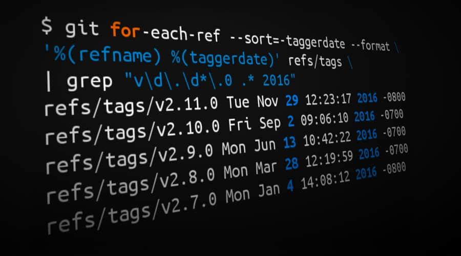 $ git for-each-ref --sort=-taggerdate --format \ '%(refname) %(taggerdate)' refs/tags | grep "v\d\.\d*\.0 .* 2016"