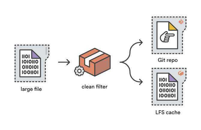 当你 git add 一个文件时,Git 的净化过滤系统会被用来在文件被写入 Git 目标存储之前转化文件的内容。Git LFS 通过使用 净化过滤器 将大文件内容存储到 LFS 缓存中以缩减仓库的大小,并且增加一个小“指针”文件到 Git 目标存储中作为替代。