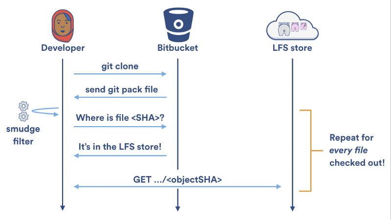 污化过滤器 是净化过滤器的对立面——正如其名。在 git checkout 过程中从一个 Git 目标仓库读取文件内容时,污化过滤系统有机会在文件被写入用户的工作区前将其改写。Git LFS 污化过滤器通过将指针文件替代为对应的大文件将其转化,可以是从 LFS 缓存中获得或者通过读取存储在 Bitbucket 的 Git LFS。