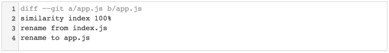 不像其他的版本控制系统,Git 不会明确地存储文件被重命名了的事实。例如,如果我编辑了一个简单的 Node.js 应用并且将 index.js 重命名为 app.js,然后运行 git diff,我会得到一个看起来像一个文件被删除另一个文件被新建的结果。