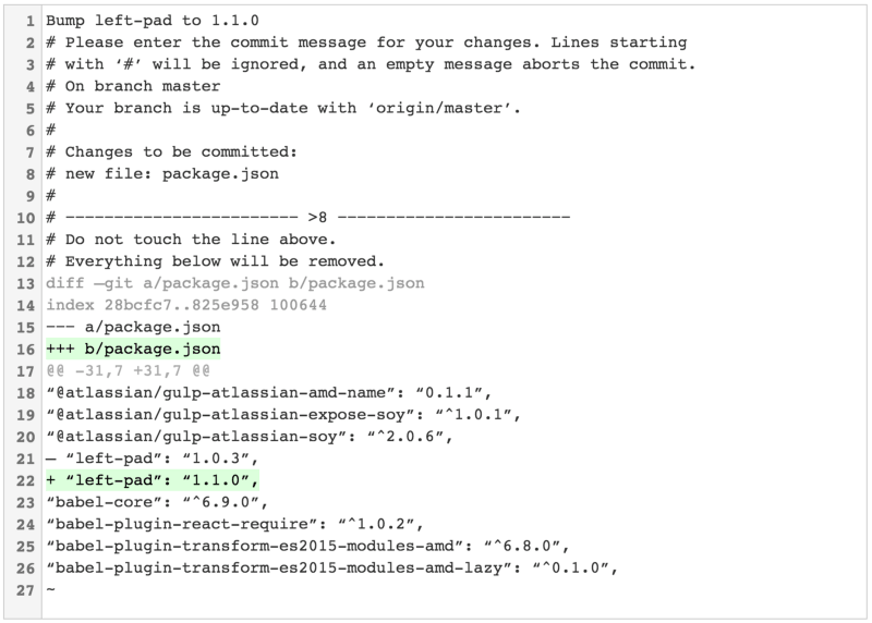 Ah crap, which dependency did I just rev? # Please enter the commit message for your changes. Lines starting # with ‘#’ will be ignored, and an empty message aborts the commit. # On branch master # Your branch is up-to-date with ‘origin/master’. # # Changes to be committed: # new file: package.json #