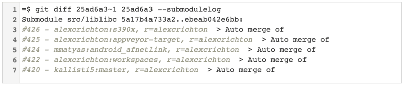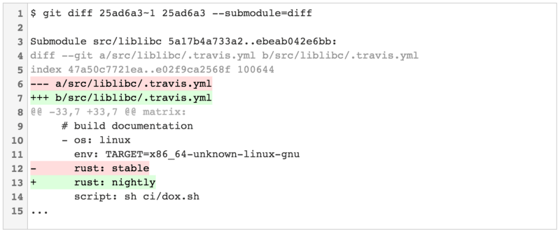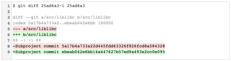 在 Git v2.11 之前,Git 有两种模式来显示对更新你的仓库子模块的提交之间的差异。