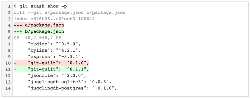 $ git stash show package.json | 2 +- 1 file changed, 1 insertion(+), 1 deletion(-)