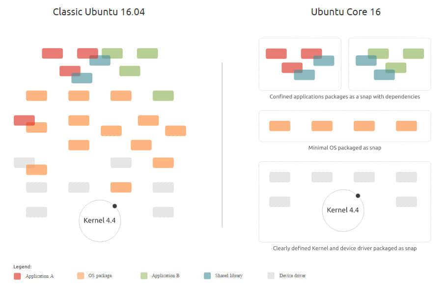 传统 Ubuntu(左)架构 与 Ubuntu Core 16