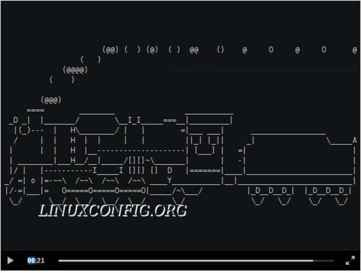 $ wget -q -O steam_locomotive.json https://asciinema.org/a/7lw94ys68gsgr1yzdtzwijxm4.json $ asciinema play steam_locomotive.json