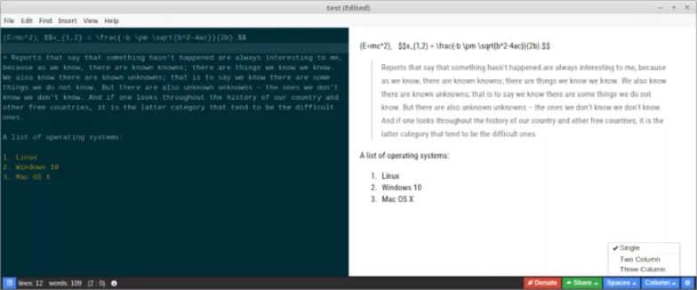 该应用有一系列有用的特性,包括拼写检查、以 HTML 格式保存文件或把富文本复制粘贴到邮件客户端。你也可以在侧窗中显示文档目录,展示语法高亮代码、以及助手、锚点和隐藏字符等。它目前正处于早期的开发阶段,因此还有一些很基本的 bug 需要修复,但它值得关注。它有两个主题可用,如果有能力,你也可以添加你自己的主题。