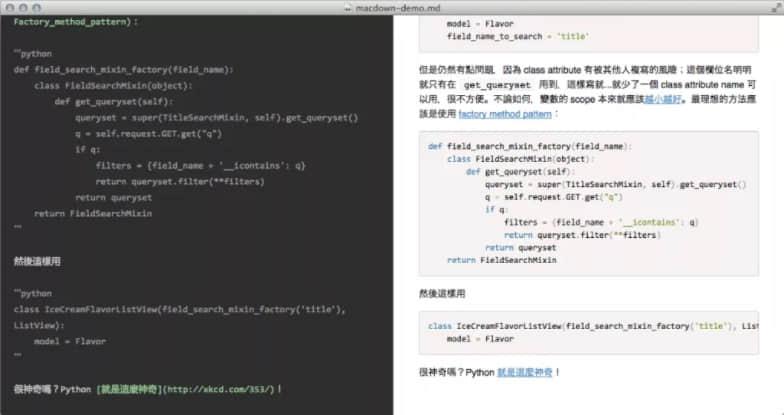 MacDown 是在这个列表中唯一一个只运行在 macOS 上的全特性编辑器。具体来说,它需要在 OX S 10.8 或更高的版本上才能使用。它在内部使用 Hoedown 将 Markdown 渲染成 HTML,这使得它的特性更加强大。Heodown 是 Sundown 的一个复活复刻。它完全符合标准,无依赖,具有良好的扩展支持和 UTF-8 感知。