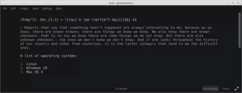 ghostwriter 有许多很好的功能设置,包括语法高亮、全屏模式、聚焦模式、主题、通过 Hunspell 进行拼写检查、实时字数统计、实时 HTML 预览、HTML 预览自定义 CSS 样式表、图片拖放支持以及国际化支持。Hemingway 模式按钮可以禁用退格键和删除键。一个新的 “Markdown cheat sheet” HUD 窗口是一个有用的新增功能。主题支持很基本,但在 GitHub 仓库上也有一些可用的试验性主题。