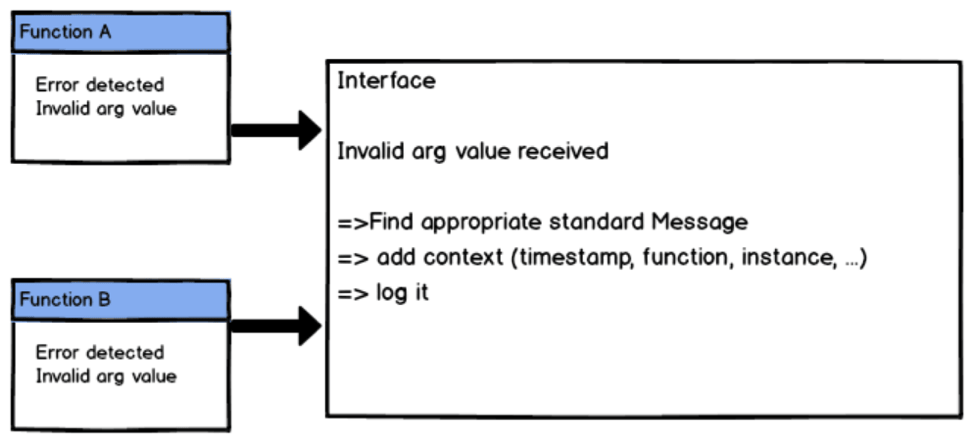 强制日志标准化的一个好的解决办法是在你的代码和日志库之间创建一个接口。这个标准化接口会包括所有你想添加到你日志中的可能行为的预定义日志消息。这么做可以防止出现不符合你想要的标准格式的自定义日志信息。这么做也便于日志调查。