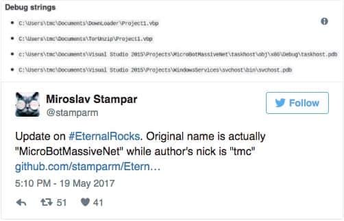 此外,“永恒之石”病毒也会用和一个与“想哭” SMB 的蠕虫病毒文件相同名字的一个文件,以此愚弄安全研究人员来误判它。
