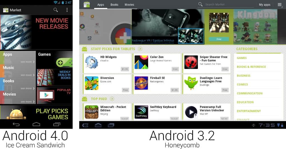 市场获得了又一个新设计。它终于再次支持纵向模式,并且添加了音乐到商店中,你可以从中购买音乐。新的市场拓展了从蜂巢中引入的卡片概念,它还是第一个同时使用在手机和平板上的版本。主页上的卡片通常不是链接到应用的,而是指向特别的促销页面,像是“编辑精选”或季度促销。