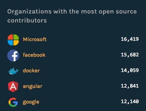 根据去年的章鱼猫报告,GitHub上开源贡献者最多的组织是微软,超过了 Facebook、docker,以及谷歌。