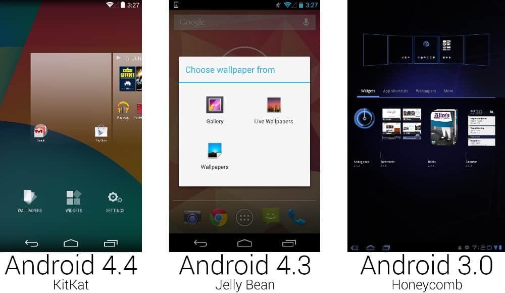 奇巧的主屏幕配置界面漂亮地对蜂巢进行了复古。在有巨大的 10 英寸屏幕的蜂巢平板上(上方右侧图片),长按主屏背景会向你展现一个所有主屏幕的缩放视图。可以从下面的小部件抽屉里将它们拖放到任意主屏上——这很方便。在将蜂巢的界面带到手机上时,从安卓 4.0 直到 4.3,谷歌都跳过了这个设计,把它留给了大屏幕设备,在手机上长按后只显示一个选项列表(中间的图片)。