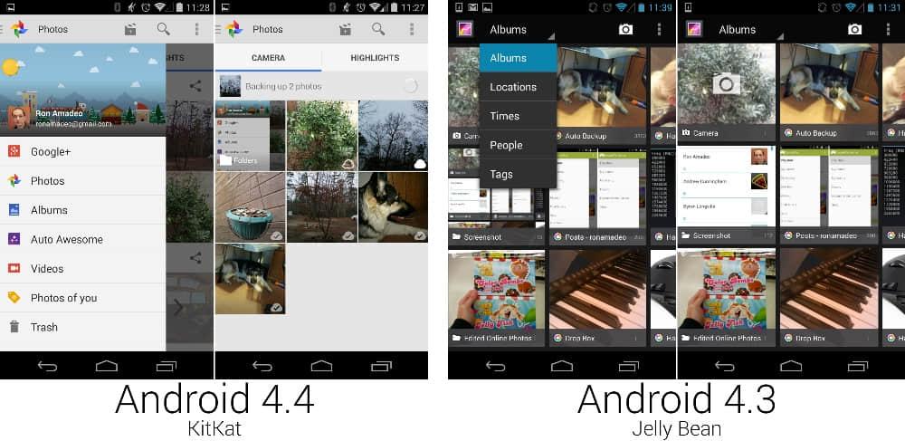 Google+ 相片和相册最初都在 Nexus 5 上随附,但在 Google Play 设备稍晚版本的奇巧上,相册被砍掉了,Google+ 完全接手了相片管理。新应用的主题从深色变成了浅色,Google+ 相片还带来了现代的导航抽屉设计。