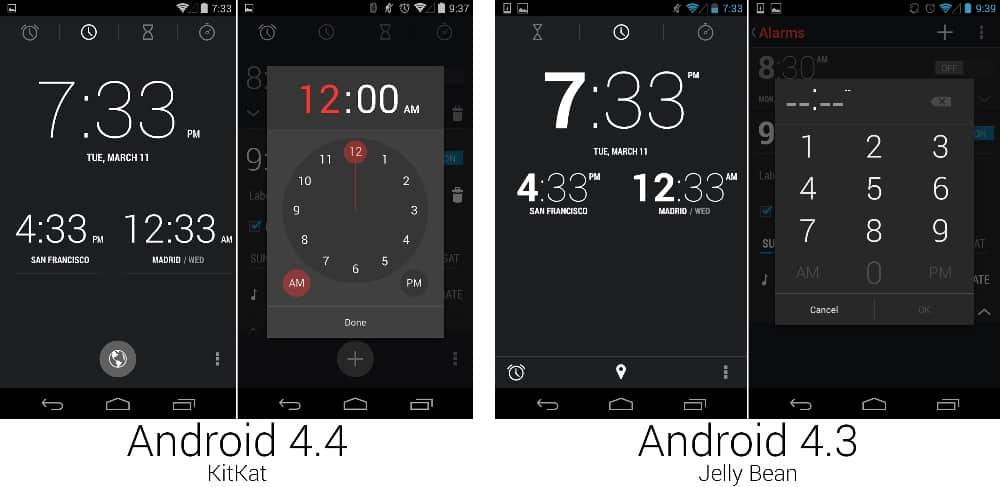 谷歌将 4.2 引入的优秀时间选择器换成了一个奇怪的时钟界面,操作起来比旧界面更慢了也更不精确了。首先是个可以选择小时的单指针时钟,然后显示的是另一个选择分钟的单指针时钟。选择的时候要转动分针或点击数字,这让用用户很难选择不是整五分钟的时间增量。不像之前的时间选择器需要选择一个时间段,这里默认时间段是 AM(重复一下,这样设置的时候容易不小心偏差 12 小时)。