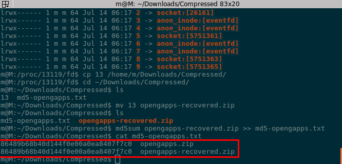 正如你在终端输出中看到的,原始文件 “opengapps.zip” 已被删除,但它仍然链接到一个文件名 13,其进程 PID 13119。但是,我们仍然可以通过将链接的文件复制到安全的地方来恢复它。