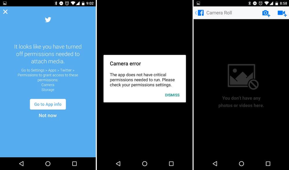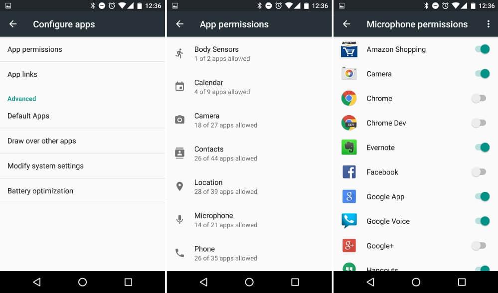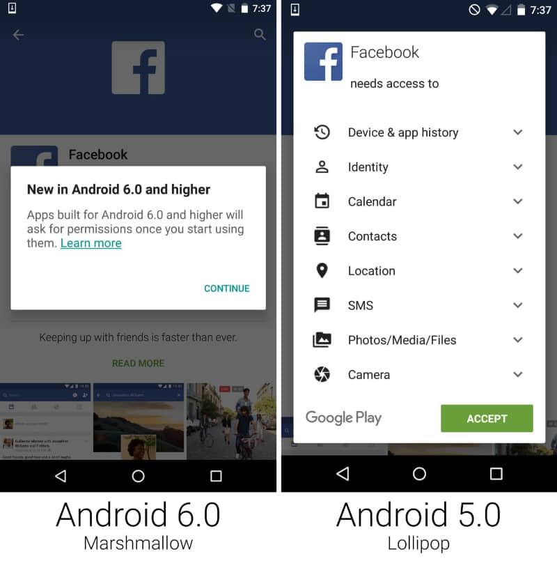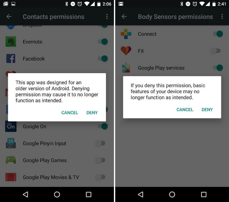 尽管谷歌在之前版本就试验过了,棉花糖的权限系统最大的不同是它代表了一个向权限系统的有序过渡。安卓 4.3 的 App Ops 从没有计划暴露给用户,所以开发者不了解它。在 4.3 中拒绝一个应用需要的一个权限经常导致奇怪的错误信息或一个彻底的崩溃。棉花糖的系统对开发者是缺省的——新的权限系统只适用于针对棉花糖 SDK 开发的应用,谷歌将它作为开发者已经为权限处理做好准备的信号。权限系统还允许在一项功能由于权限被拒绝无法正常工作时与用户进行沟通。应用会被告知它们的权限请求被拒绝,它们可以指导用户在需要该功能的时候去打开该权限访问。