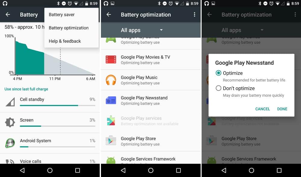 对于应用待机而言,和一个应用“交互”意味着打开一个应用,开始一项前台服务,或者生成一条通知。任何其中的一条操作就会重置该应用的待机计时器。对于每种其它边界情况,谷歌在设置里添加了一个名字意味模糊的“电池优化”界面。用户可以在这里设置应用白名单让它免疫应用待机。至于开发者,他们在开发者设置中有个“不活跃应用”选项可以手动设置应用到待机状态来测试。