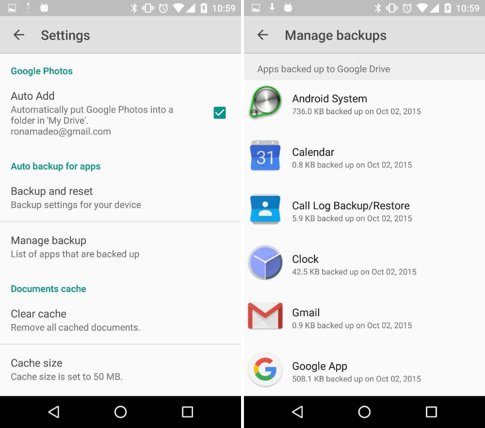 到界面这里,棉花糖的备份系统使用了谷歌 Drive 应用。在谷歌 Drive 的设置中有一个“管理备份”界面,不仅会显示新备份系统的应用数据,还有谷歌过去几年尝试的其它应用备份方案的数据。