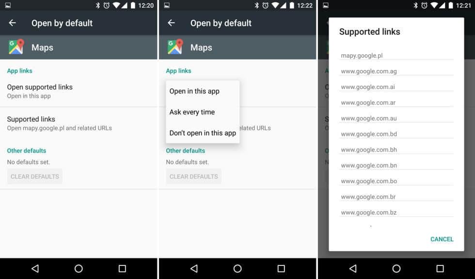藏在设置里的还有一个新的“应用关联”功能,它可以将应用“链接”到网站。在应用关联出现之前,在全新安装的机器上打开一个谷歌地图链接通常会弹出一个“使用以下方式打开”的对话框,来获知你是想在浏览器还是在谷歌地图应用中打开这个链接。