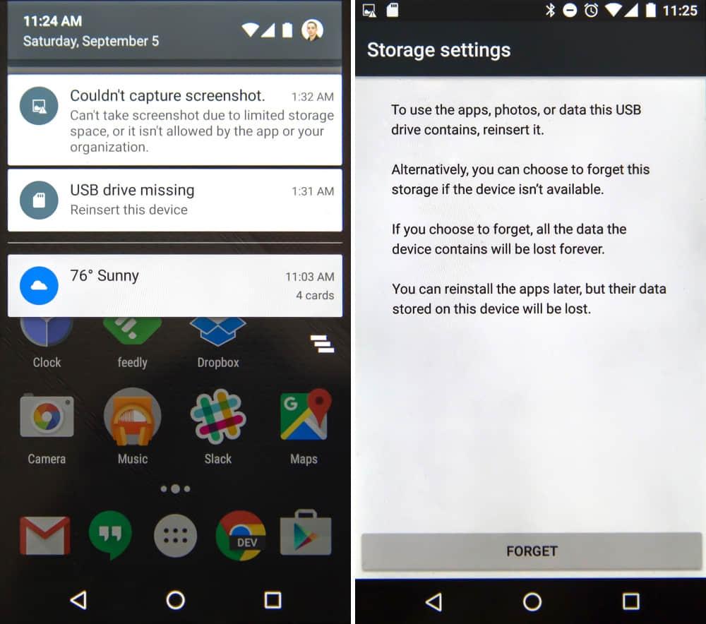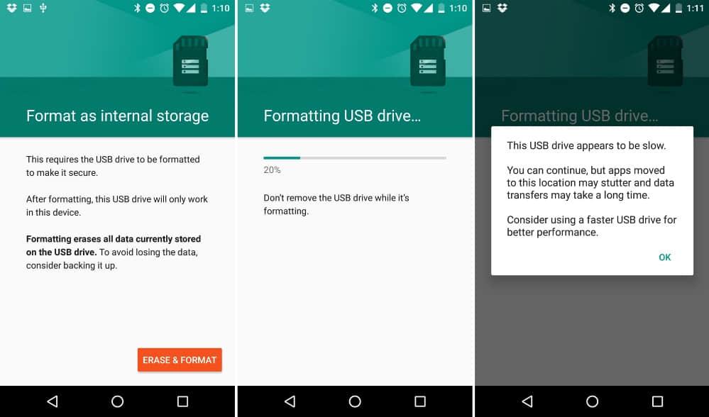 不幸的是实际上可以使用可选存储的设备很长时间都没有出现。Nexus 设备不支持存储卡,所以为了测试我们插上了一个 U 盘作为我们的可选存储。OEM 厂商最初抵制这项功能,LG 和三星都在他们 2016 年初的旗舰机上禁用了它。三星说“我们相信我们的用户需要 microSD 卡是用来在手机和其它设备之间转移数据的”,一旦卡被格式化成 ext4 这就不可能了。