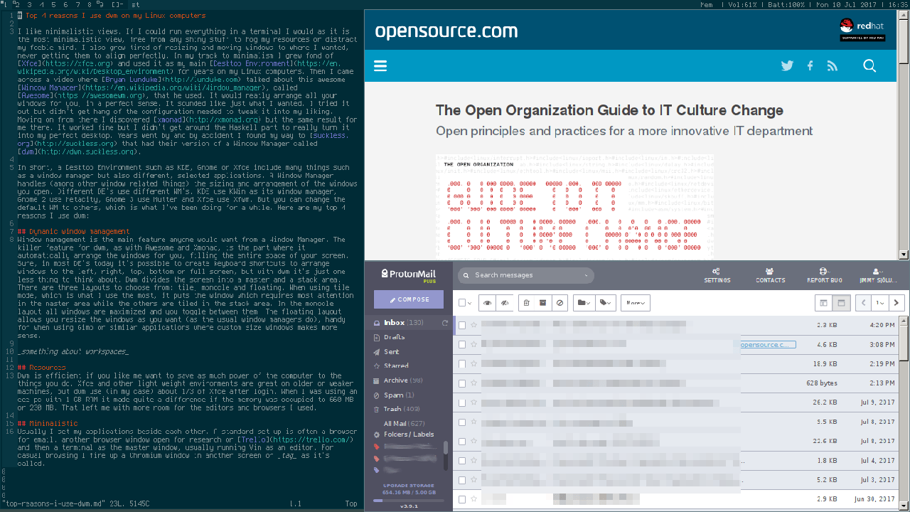 通常,我让我的应用程序彼此相邻:作为主窗口的终端(通常运行着 Vim)、用来查阅邮件的浏览器,和另外一个用来查阅资料或者打开 Trello 的浏览器窗口。对于临时的网页浏览,我会在另一个工作空间或者说是另一个 标签 中开启一个 Chromium 窗口。