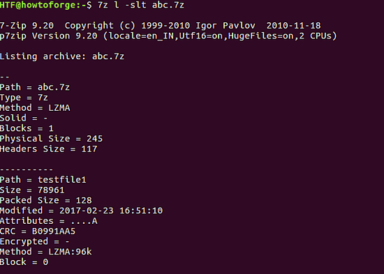 如果需要,7z 还可以在标准输出中显示归档的技术信息 - 类型、物理大小、头大小等。可以使用 -slt 开关使用此功能。 此开关仅适用于带有 l 功能字母的情况下。