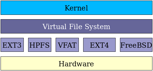 这两层中的第一层是 Linux 虚拟文件系统。虚拟文件系统提供了内核和开发者访问所有类型文件系统的的单一命令集。虚拟文件系统软件通过调用特殊设备驱动来和不同类型的文件系统进行交互。特定文件系统的设备驱动是第二层实现。设备驱动程序将文件系统命令的标准集解释为在分区或逻辑卷上的特定类型文件系统命令。